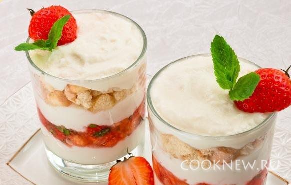 В креманки выложить смесь, сверху ломтики клубники, на них слой смеси, слой печенья и слой смеси. Поставить на час в холодильник.