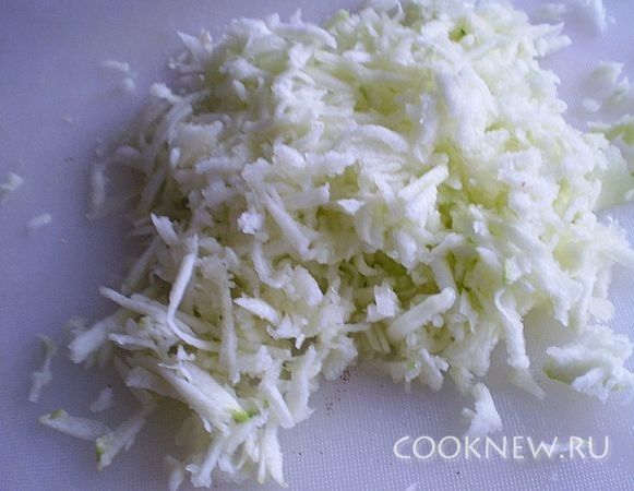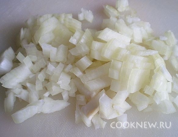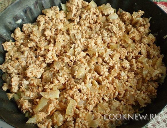 Лук мелко рубим и добавляем обжариваться к фаршу.