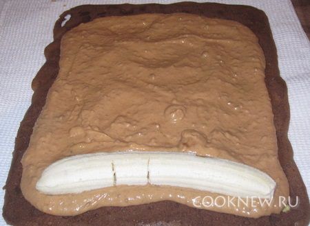 Переворачиваем и смазываем кремом (сгущенка + сметана). Кладем банан.