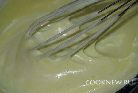 Желтки взбить с половиной сахара в густую пену. Белки со щепоткой соли взбить в тугую пену и добавить оставшийся сахар. Соединить обе массы вместе, добавляя постепенно муку, постоянно помешивая.