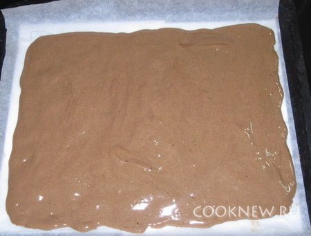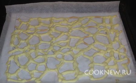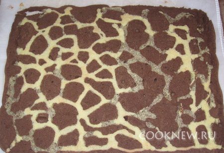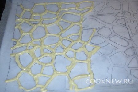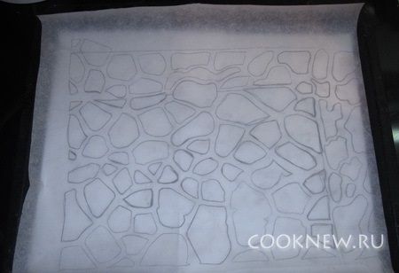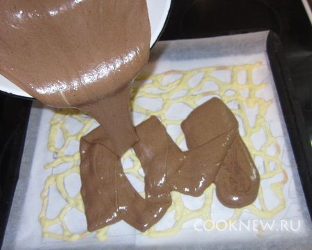 Смазать растительным маслом. Из пакета или кулинарного шприца выдавить белое тесто по рисунку. Ставим в духовку 180 С на 3 минуты. В это время добавляем в оставшееся тесто какао.
