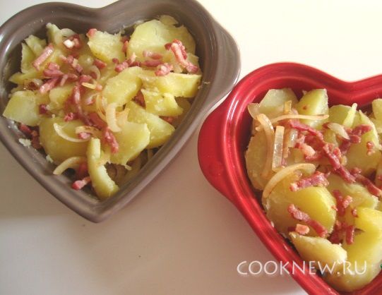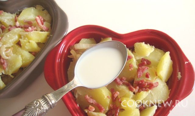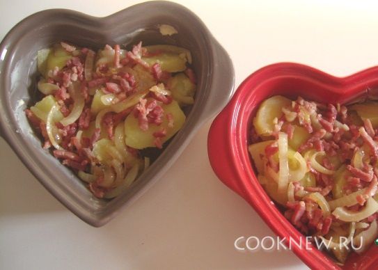 Повторить слои - выложить оставшуюся половину картофеля и бекона с луком.