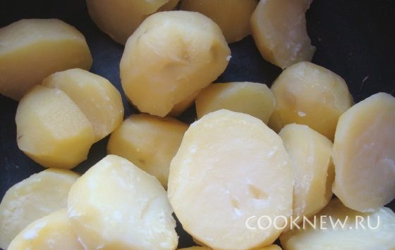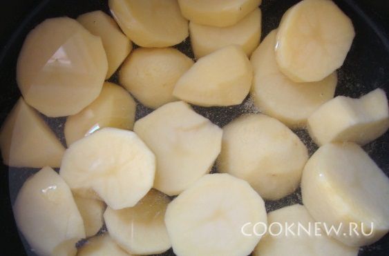Нарезать крупными ломтиками (картошку разрезать части на 3) и отварить в подсоленной воде.