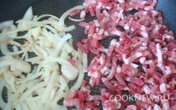 К луку добавить порезанный бекон, обжарить пару минут.