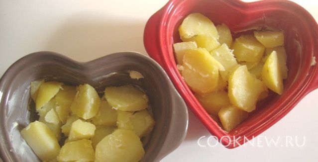 Картофель порезать ломтиками и половину положить в формочки.