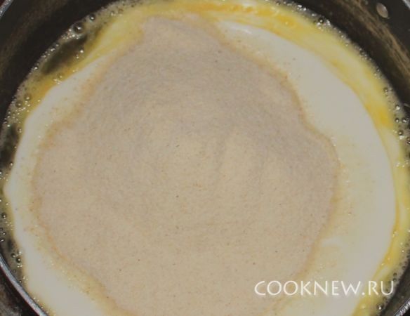 Добавляем манку и кефир. По желанию добавить ванилин и разрыхлитель.