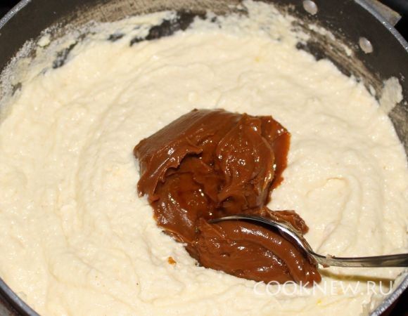 Все хорошо перемешиваем, добавляем маргарин 60-80 грамм и добавляем сгущенку.