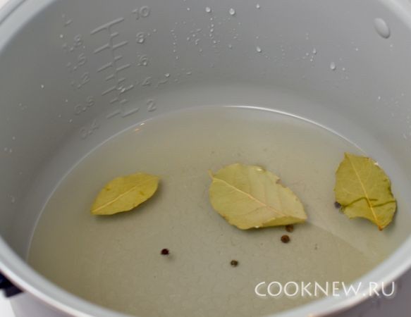 В мультиварку наливаем 2-3 стакана воды, солим, кидаем лавровый лист, по вкусу можно добавить перец горошком.