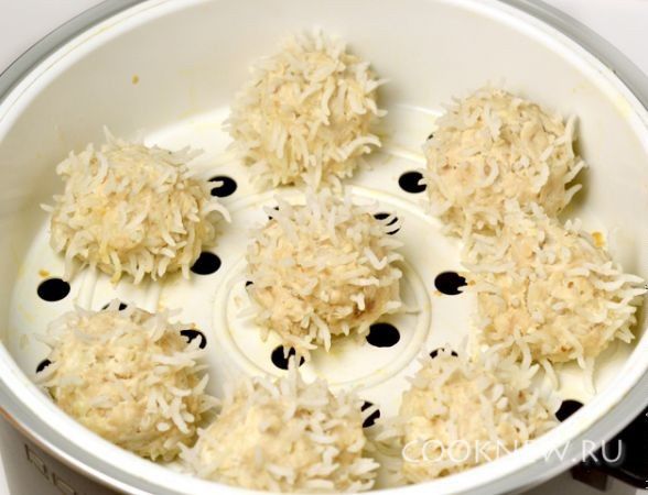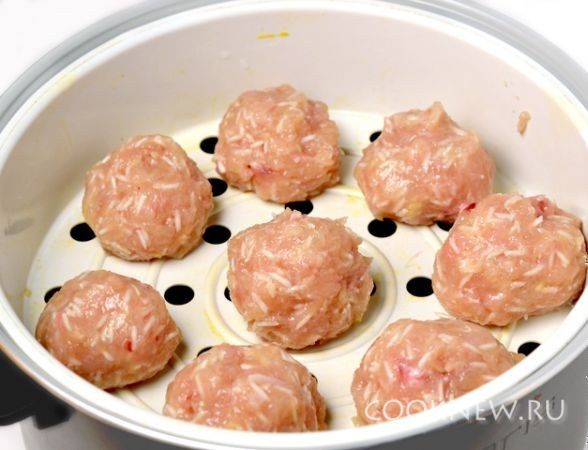 Вставляем чашу для варки на пару, формируем тефтели мокрыми руками. Выставляем режим варка на пару и готовим приблизительно 40 минут.