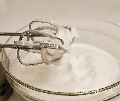 Белый шоколад растопить на водяной бане. Белки взбить с половиной сахара до устойчивых пиков.