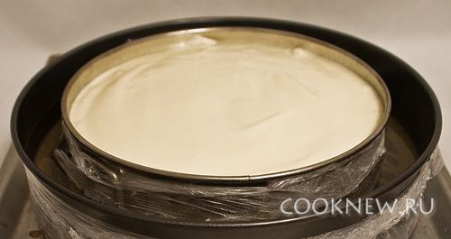 Выложить в форму для выпекания. Форму поставить в глубокий противень, до половины заполненный кипятком, выпекать при 180 С 45-50 минут. Второй вариант: Поставить в другую форму с кипятком и обернуть пленкой (чтобы вода не попала в тесто).