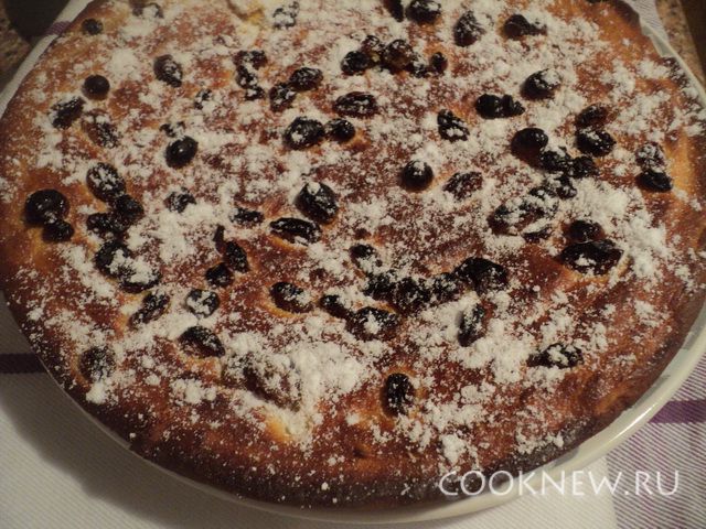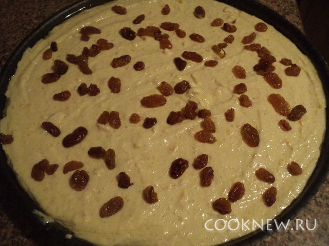 Ввести в смесь, оставить на 1,5 часа для набухания. Выложить в форму, смазанную маслом, выложить изюм.