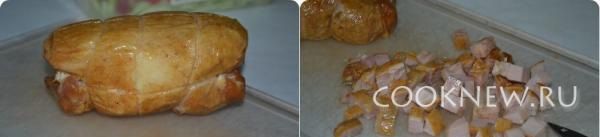 Режем курицу кубиками.