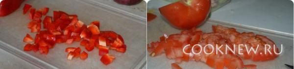 Перец и помидор тоже режем кубиками.