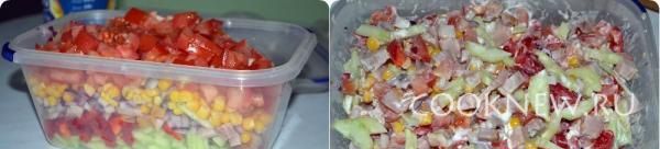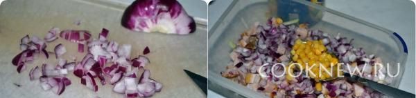Все смешиваем и добавляем порезанный лук и добавляем кукурузу.