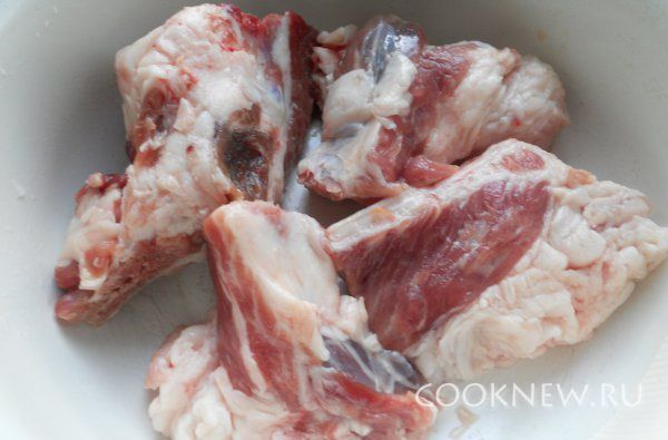 Ребра разрезаем на куски, заливаем водой, доводим до кипения,солим снимаем пену и варим 40 минут.