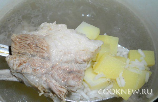 После 40 минут варки, к ребрам добавляем картофель и промытый рис.