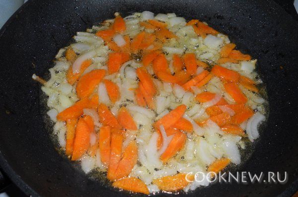 Морковь и лук, чистим, рубим и обжариваем на масле.