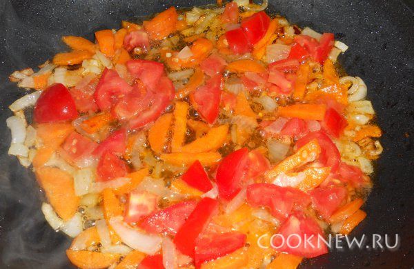 Добавляем нарезанные помидоры и тушим минут 5.