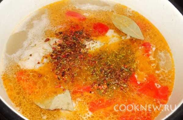 Добавляем в кастрюлю нашу пережарку, солим, перчим по вкусу, добавляем специи по вкусу, лавровый лист и мелко порубленный чеснок. Варим еще 7 минут, затем отключаем плитку и даем настояться минут 10.
