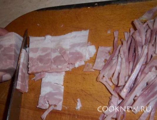 Очистить перец сладкий от семян, порезать тонкими полосками. Также порезать бекон.