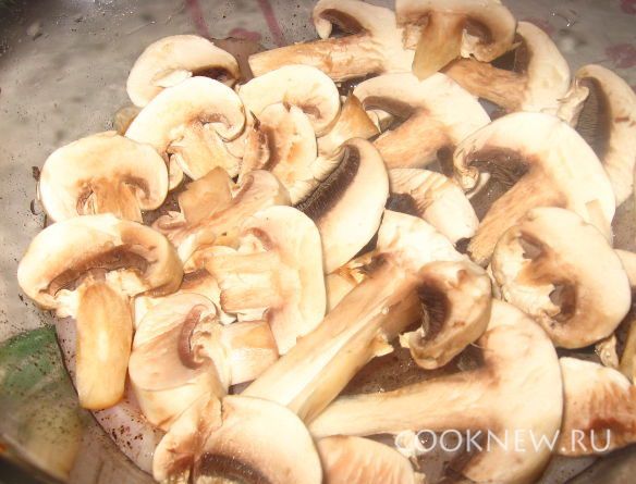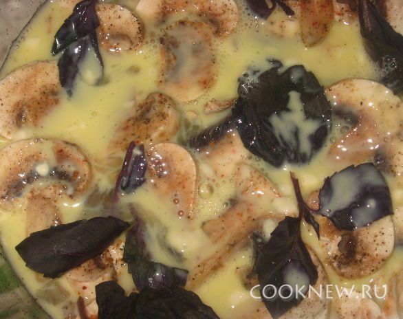 Грибы добавить к курице, все залить яичной смесью и поставить в духовку на 20 минут при температуре 160 С.