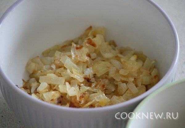 Лук обжариваем на 2 ложках сливочного масла, оставляем 1 столовую ложку для начинки.