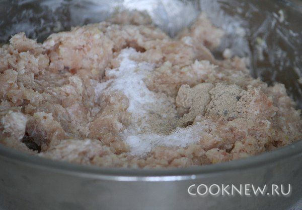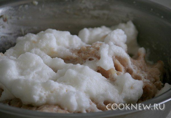 Перекручиваем на второй раз, добавляем постепенно сливки. Взбиваем белок и вводим в фарш.