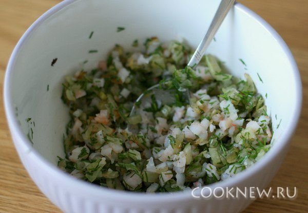 Делаем начинку-соединяем 1 столовую ложку поджаренного лука, 2 столовых ложки мелко нарезанных креветок и 1 столовую ложку укропа.