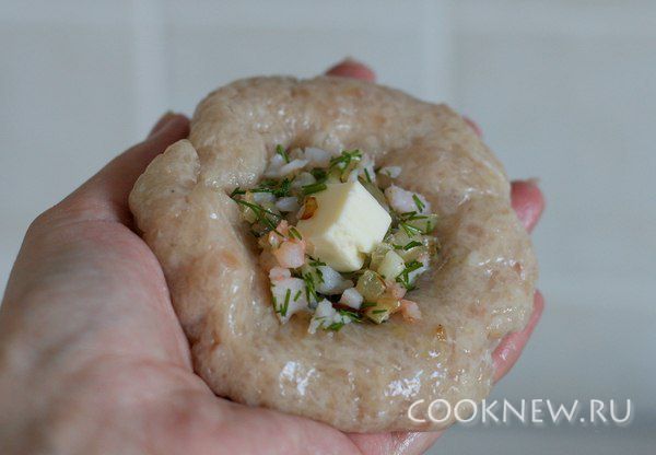 Муку высыпать в тарелку, в плошке взбить яйцо. Из фарша формируем лепешку, в центр кладем 1 чайную ложку начинки и кубик сливочного масла. Делаем шарик.