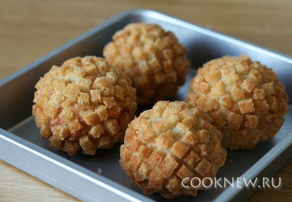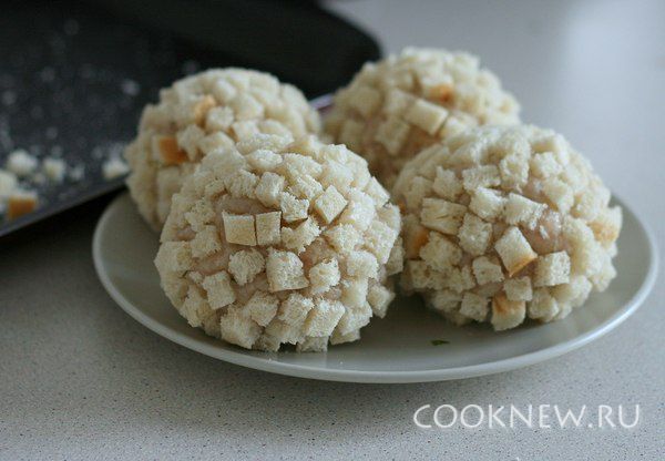 Из батона нарезаем маленькие кубики. Окунаем шарик в муку, затем в яйцо и затем в сухари.