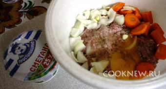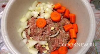 Лук, чеснок и морковь почистить, нарезать небольшими кусочками, соединить с фаршем. Добавить яйцо. Перемешать, посолить по вкусу.