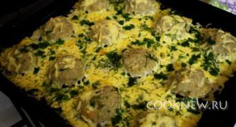 Поставить в разогретую до 200С духовку на 30 минут. Затем достать, посыпать тертым сыром и поставить еще на 15 минут.