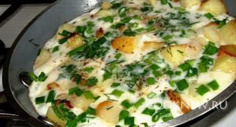 Картофель залить массой и посыпать зеленью. Довести на плите до готовности яиц.