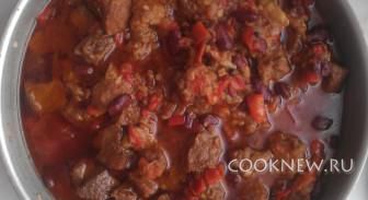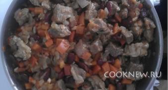 В овощи выкладываем мясо, отваренную фасоль, помидоры и томатную пасту. Солим, перчим по вкусу, все перемешиваем.