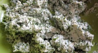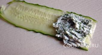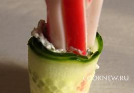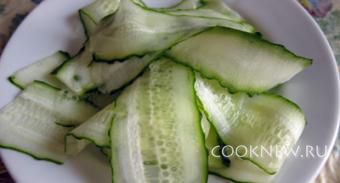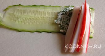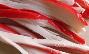 Крабовые палочки нарезать полосками, разрезать их пополам.