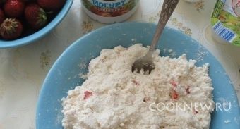 Для того, чтобы сырники получились более сочными берем разный творог-5% и 9% - по 250 гр каждого. Разминаем вместе в миске. Добавляем полстакана клубничного йогурта. Добавляем сахар. Хорошо перемешиваем.