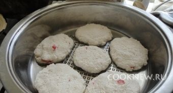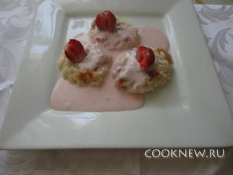 По желанию, если есть, добавляем клубнику. Просеиваем к творогу муку. Выкладываем в разогретую сковородку с маслом.