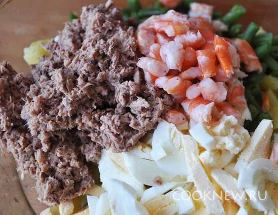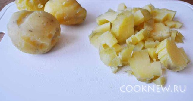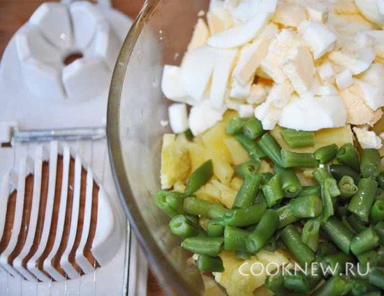 Отварить яйца, картофель в мундире, стручковую фасоль. Остывший картофель режем кубиками.
