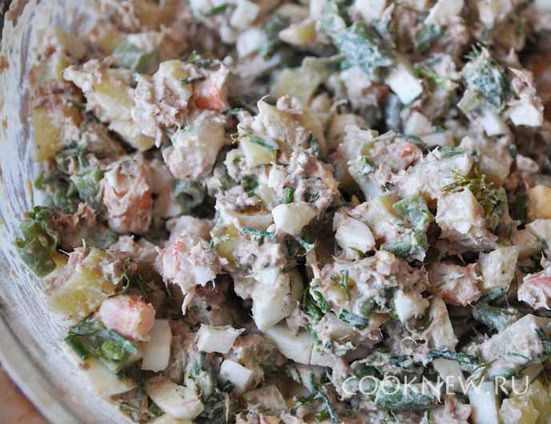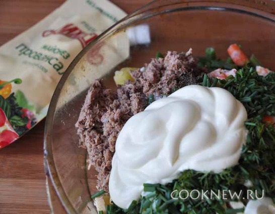 Добавляем порубленную зелень и майонез.