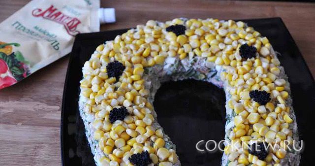 Украшаем сверху кукурузой и любой икрой.