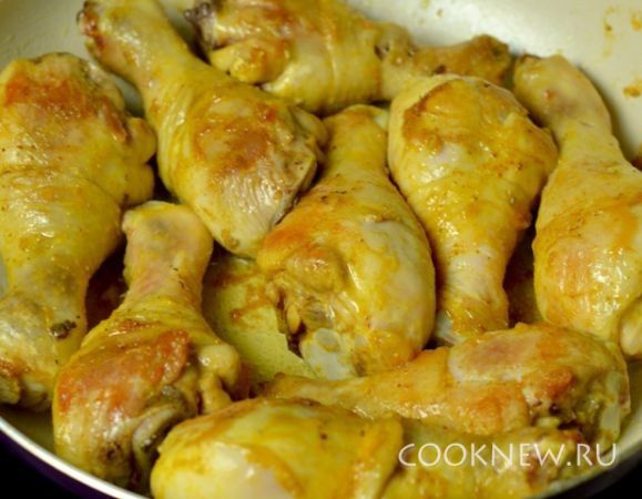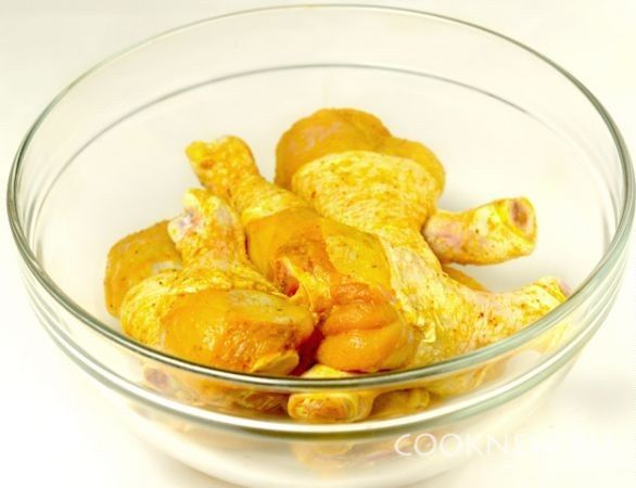 Курицу замариновать: обмазать карри, кориандром и солью. Оставить пропитываться.