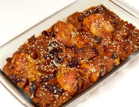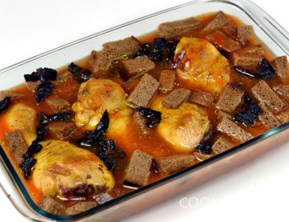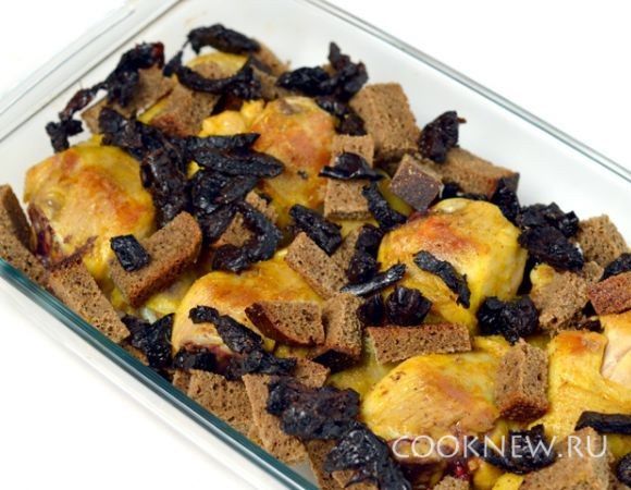 В форме соединяем курицу, хлеб и чернослив.