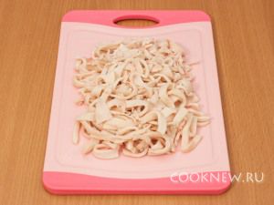 Затем кальмары порезать соломкой.