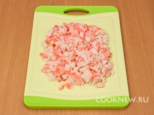 Мелко порезать крабовые палочки.