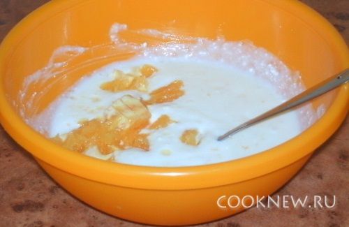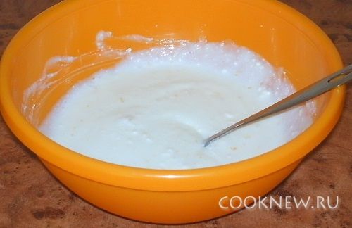 В кефир добавить соду, ванилин, сахар и 1 щепотку соли. Перемешайте и отложите на пару минут.