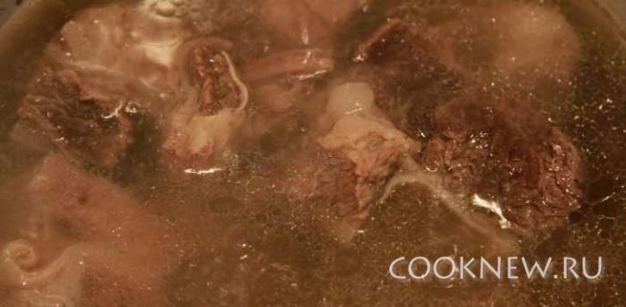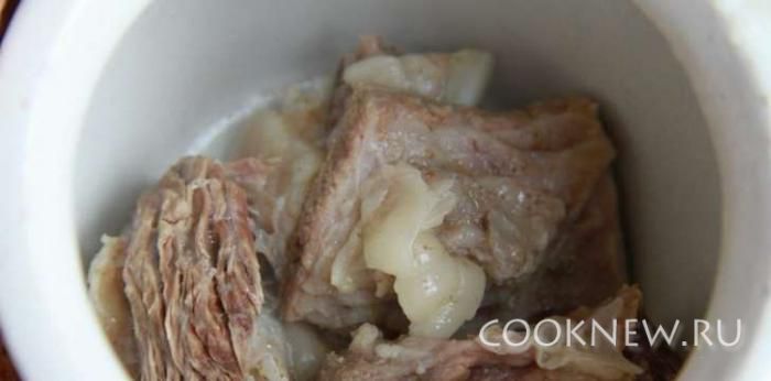 К луку влить бульон, в котором варилось мясо (приблизительно 6 стаканов), соевый соус, прованские травы по вкусу. Варить 15 минут. В горшочки выложить мясо.