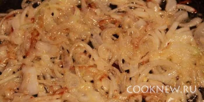 В сковороду с маслом положить лук и сахар, поджаривать до тех пор пока лук не станет карамелизироваться.