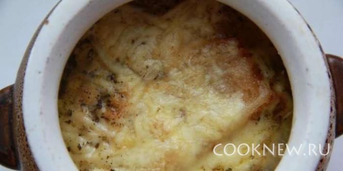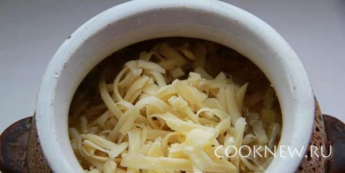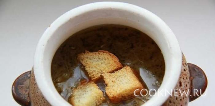 Вылить луковый бульон в горшочки, положить сухари.