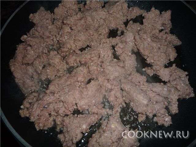 Репчатый лук измельчить, добавить в фарш и все обжарить. Немного посолить.